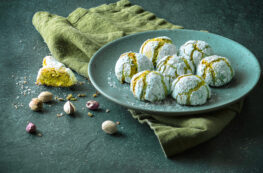 Измельчить ножом вяленые томаты и чёрные оливки, удалив сначала косточки. Кедровые орешки также можно слегка измельчить, предварительно обжарив их на сухой сковородке до лёгкого золотистого цвета.