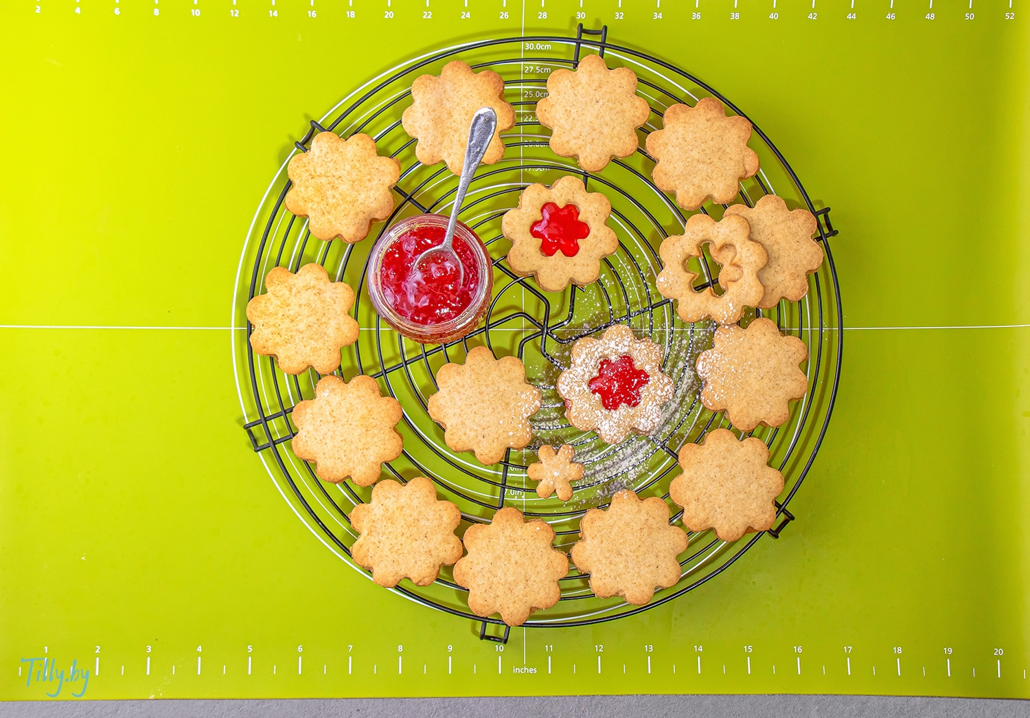 Когда печенье полностью остынет, посыпьте печенье с окошками сахарной пудрой, а на нижние части без окошек положите 1 чайную ложку джема. Накройте печеньем с окошком и слегка прижмите.