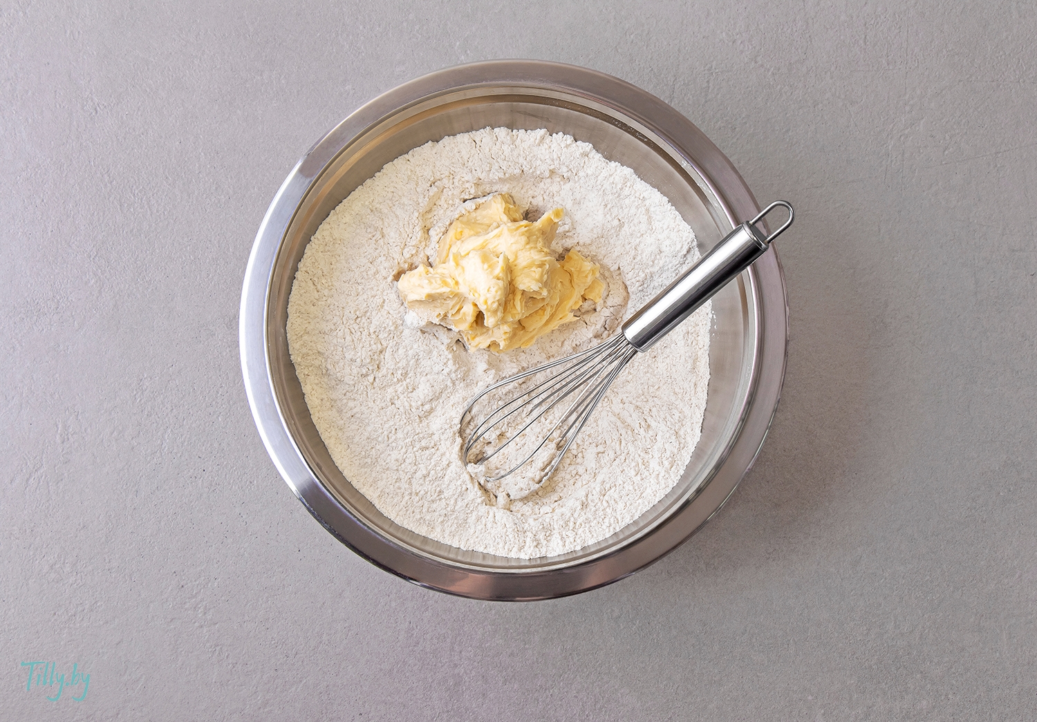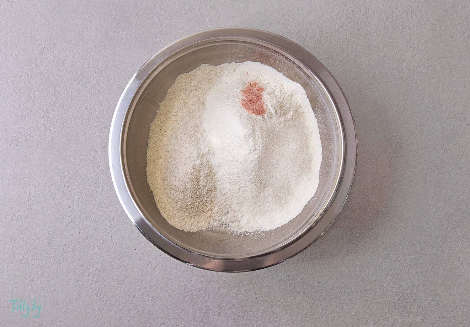 Просейте оба вида муки в миску, добавьте соль и перемешайте венчиком.
