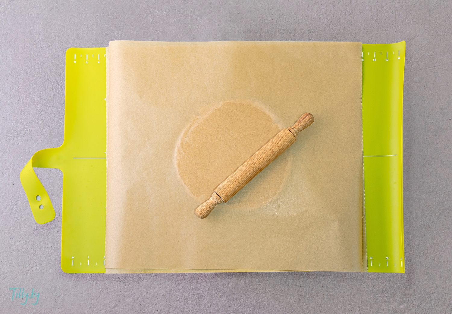 Положите силиконовый коврик на поверхность и возьмите два листа пергаментной бумаги. Одним листом укройте коврик, чтобы удобно было раскатывать и предотвратить скольжение, и уложите сверху на него тесто. А теперь накройте вторым листом и раскатайте тесто до толщины 3-5 мм.